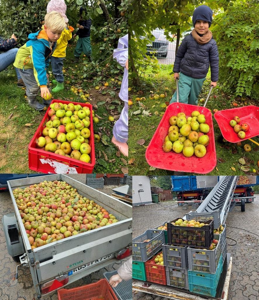 Die Kinder nahmen sich also vergangene Woche Eimer, Kisten und Schubkarren und unsere Kindergartenmama Frau Reusch stellte freundlicherweise ihren Anhänger zur Verfügung. Dann schüttelten die Erzieher des Kindergartens den Baum und in kürzester Zeit fanden alle Äpfel den Weg in die Kisten und den Anhänger.